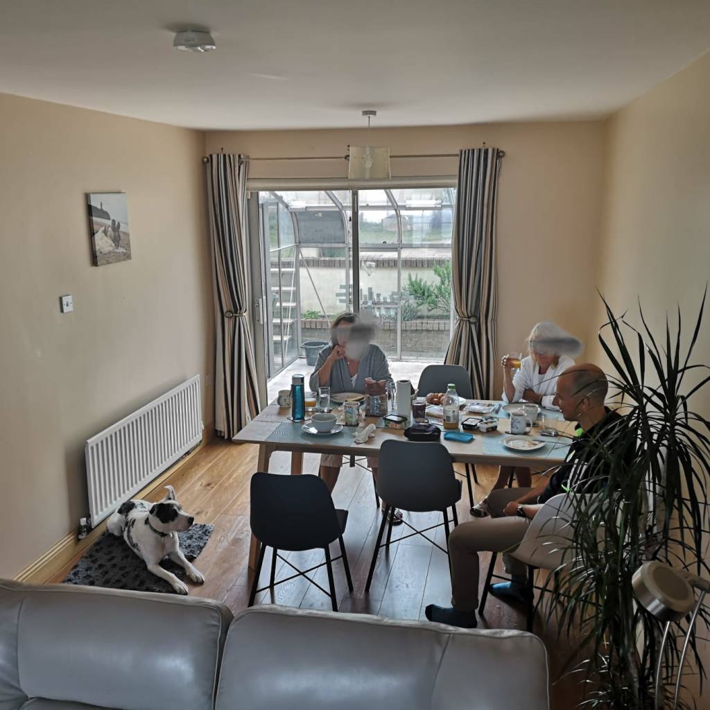 Here he is, lying quietly on his mat while not just his humans but also guests have a meal together. Given that he’s a new dog to the home and how arousing guests can be, that’s a pretty awesome achievement: