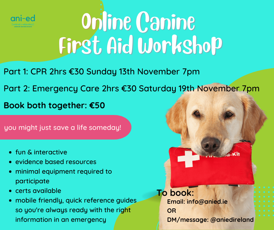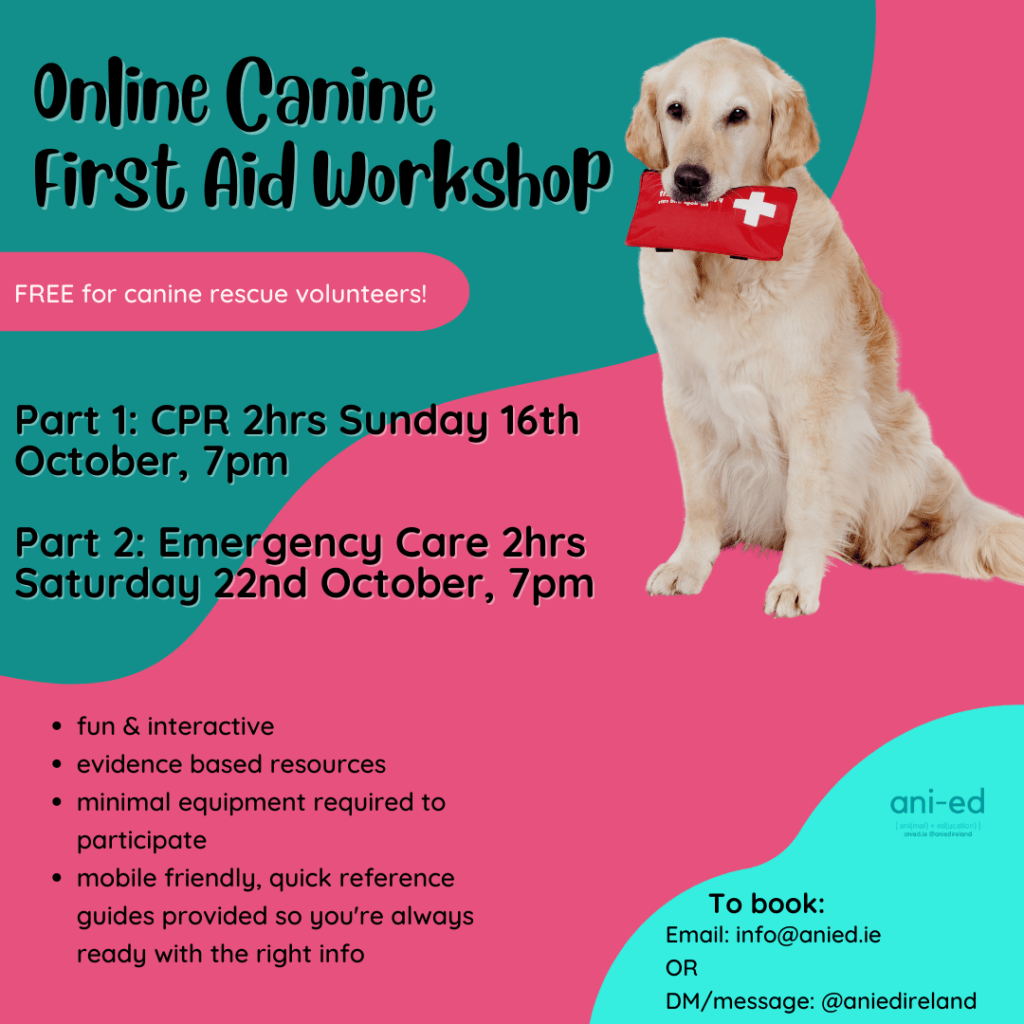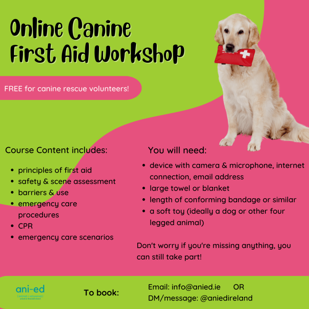 For rescue folks, we have a FREE Online Canine First Aid workshop for you! It’s exactly the same as all the others, with the same great guidance and resources, but it’s free!
