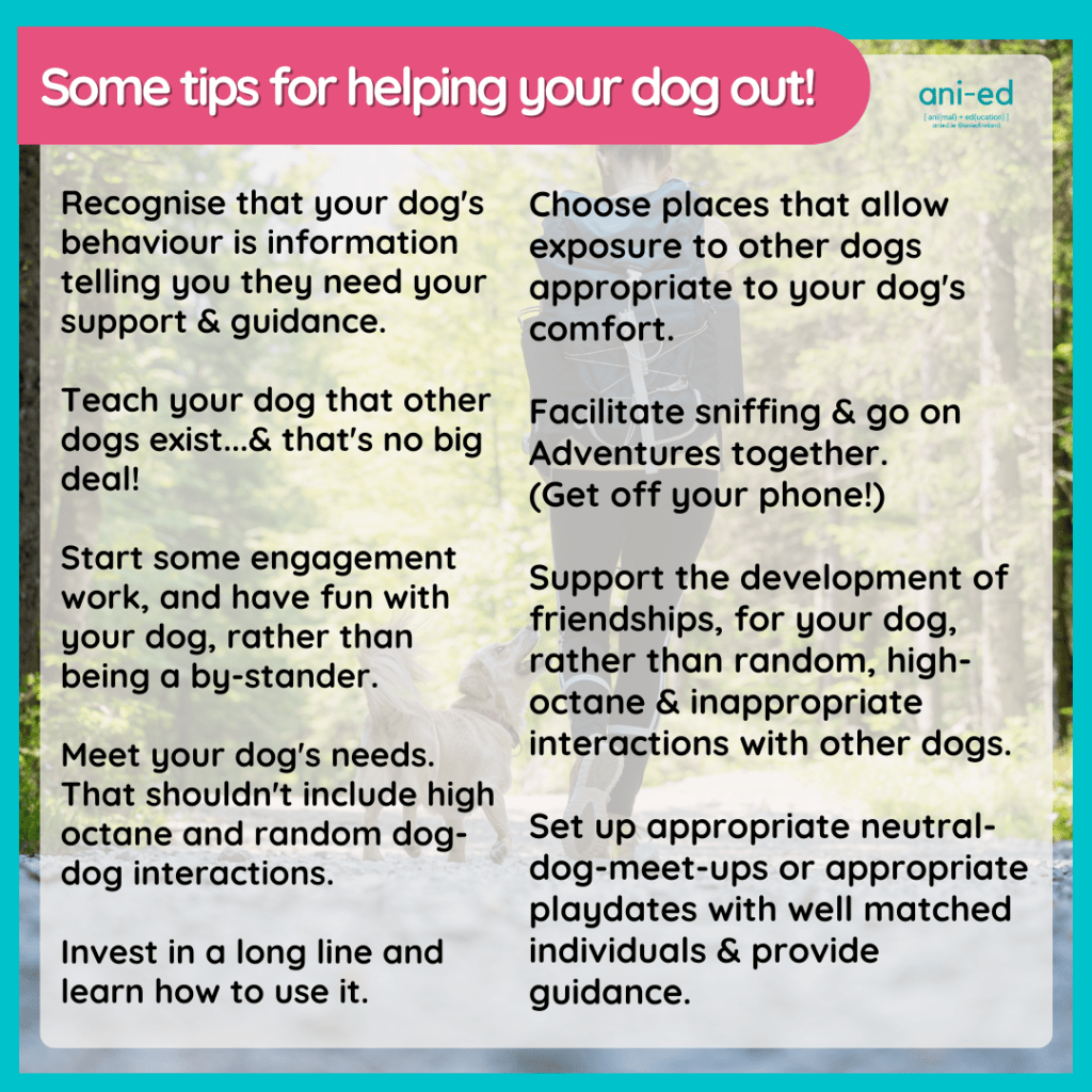 Allowing this to happen, is not “socialisation”, it’s not benefitting your dog, and it’s most certainly damaging to other dogs and their humans. If your dog can’t manage the distance or situations at which you expose them to other dogs without lunging, pulling, staring, running up to, getting excited or anything other than some glances, some sniffing and information gathering and moving on, your dog needs help.