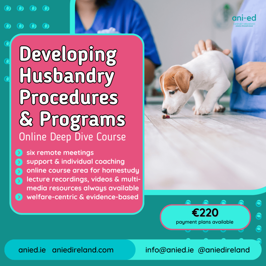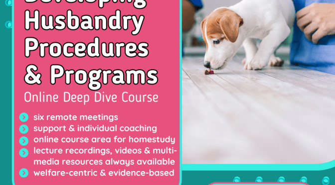 - about 20 mini-lectures (in the form of written presentations supported by videos, images, exercises & multi-media resources) covering husbandry program development and related evidence presented in small-ish bites so that you can take time to process and analyse