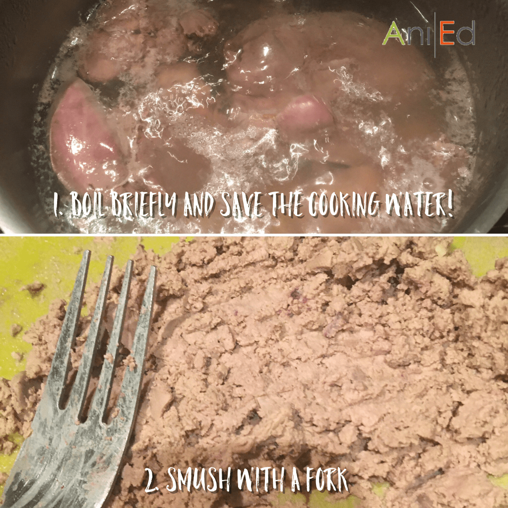 For the treats demonstrated here, I have used chicken livers as the base. I buy them in bulk and divide them out into treat-recipe-portions and then freeze them. They are super tasty, nutritious in small amounts, and are quick to cook.