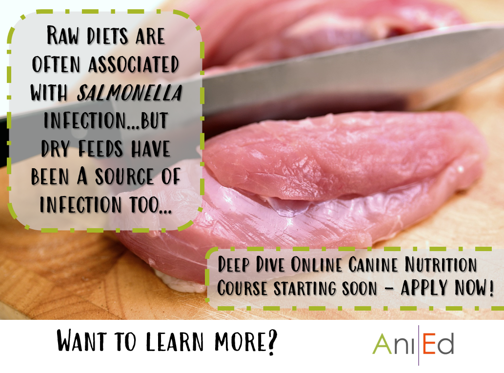 Image reads: Raw diets are often associated with Salmonella infection…but dry feeds have been a source of infection too…