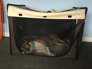 have your dog’s bed in there and his favourite toys there