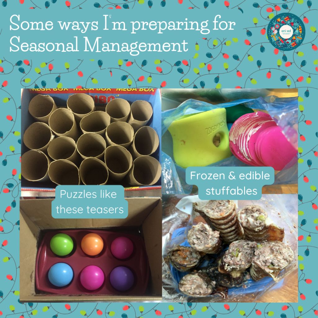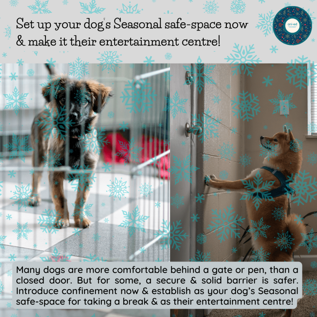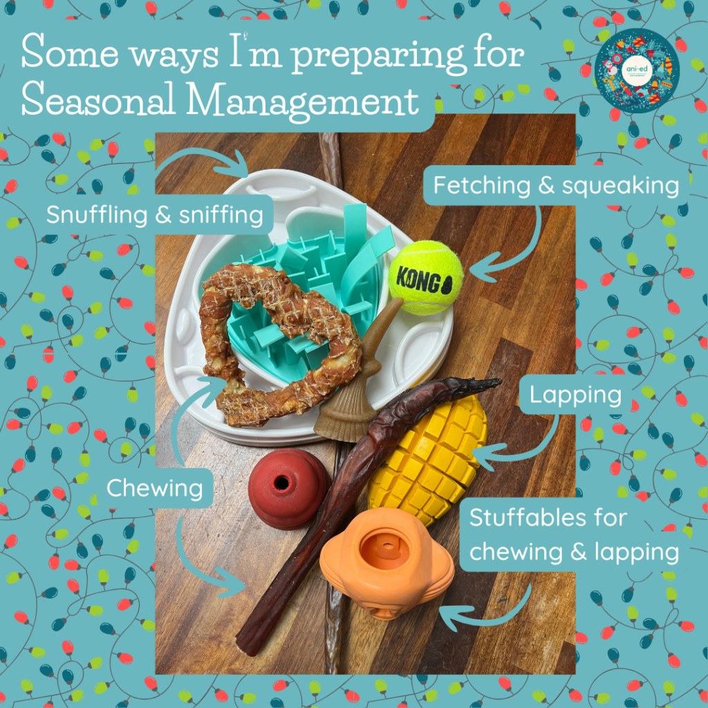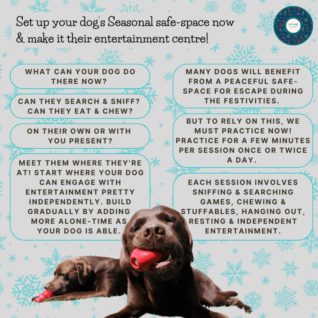 4. Entertaining Canines (tutorials for you to practice) – set your dog up for Seasonal success by providing appropriate entertainment, and, where helpful, a Seasonal safe-space established as their entertainment-centre.