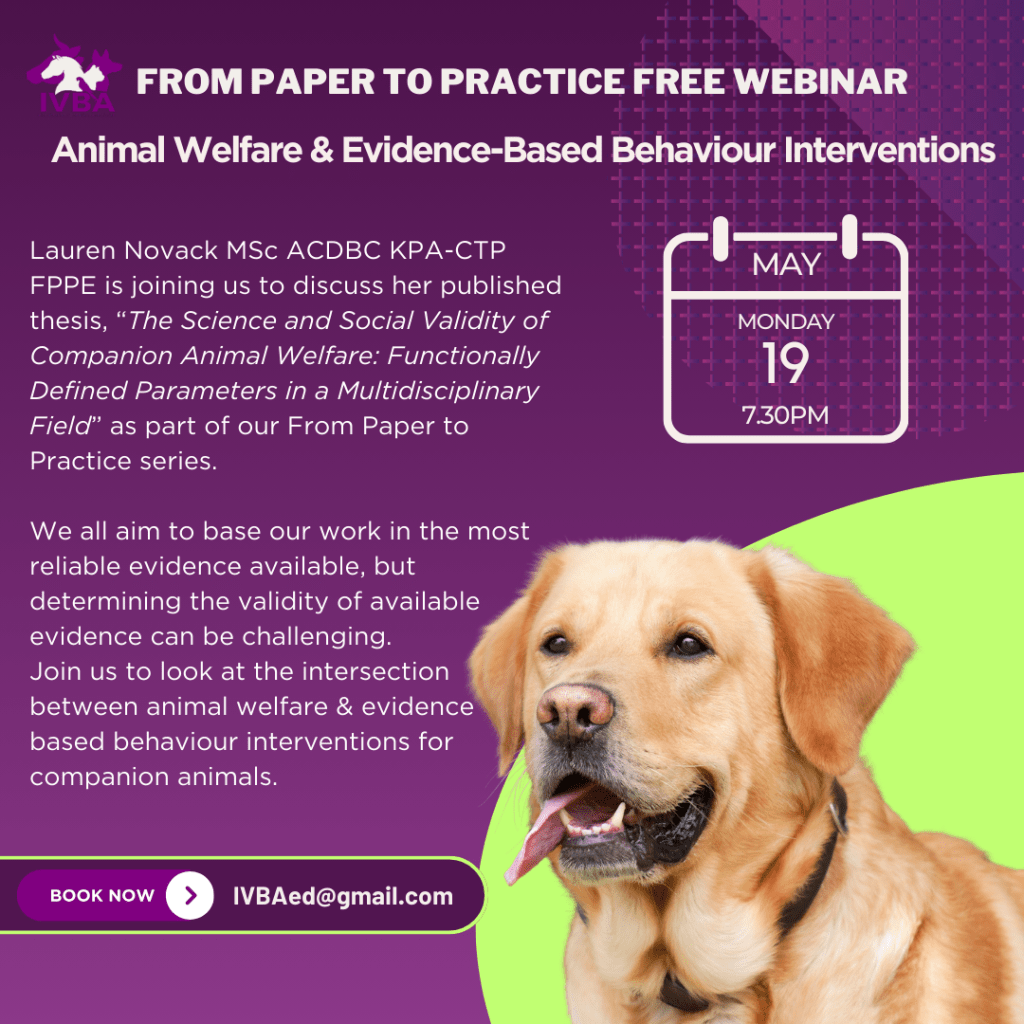 We all aim to base our work in the most reliable evidence available, but determining the validity of available evidence can be challenging. Join us to look at the intersection between animal welfare & evidence based behaviour interventions for companion animals. Join us for free on 19th May!